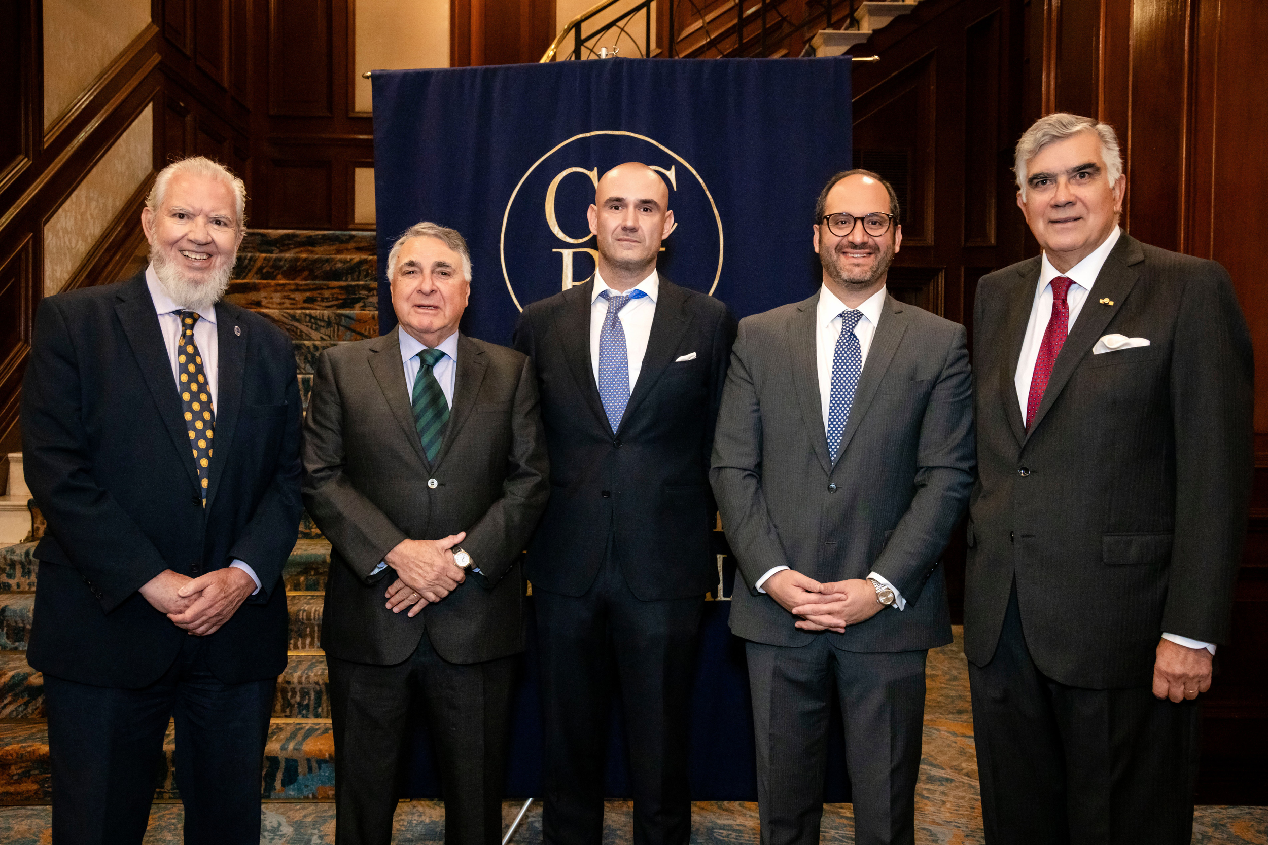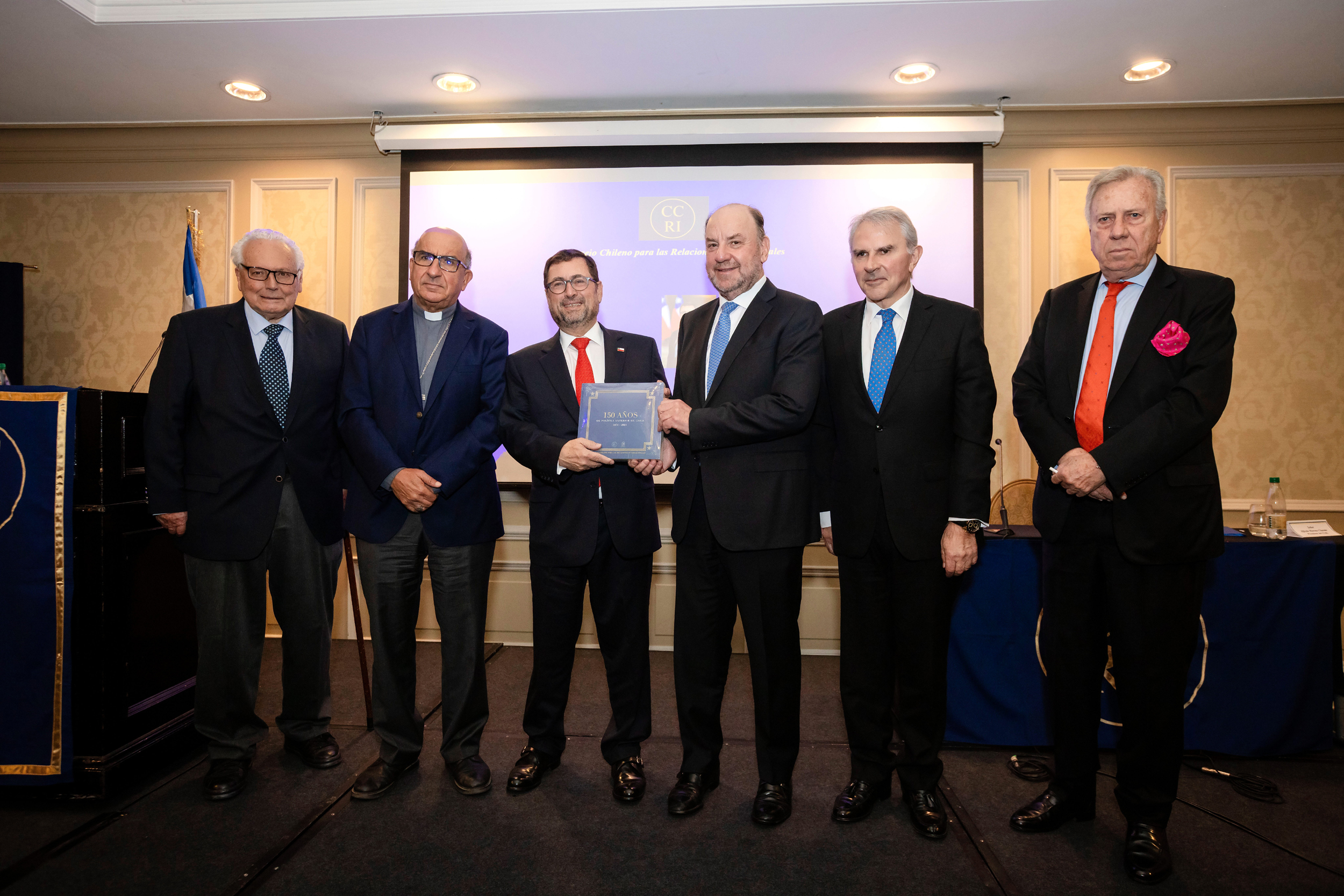 Cristián Zegers, director del CCRI, Cardenal Fernando Chomalí, Canciller Francisco Pérez Mackenna, Alfredo Moreno, presidente del CCRI, senador Iván Moreira, Hernán Felipe Errázuriz, director del CCRI